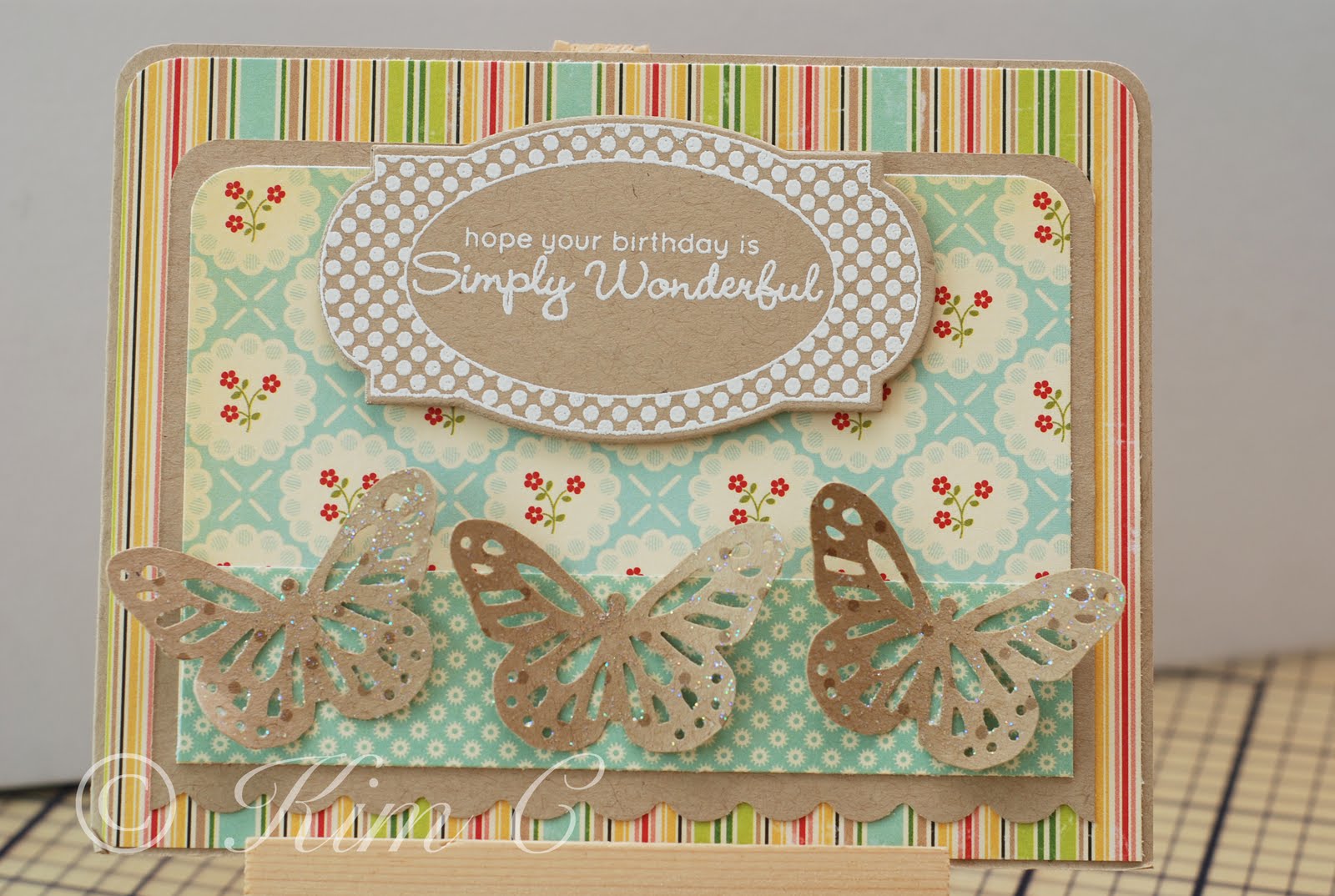 The sentiment on the card says "hope your birthday is Simply Wonderful". The butterflies have a shimmer effect added on to them.